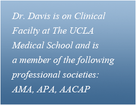 Dr. Davis is on Clinical Faculty at the UCLA Medical School, a Staff Psychiatrist at the Mind Health Institute, and is member of professional societies: AMA, APA, AACAP.